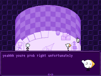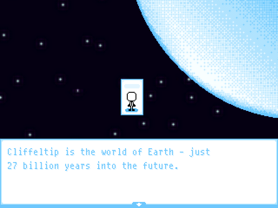 It's Earth, 27 billion years into the future. In this time period, life for people is quite simple. Nobody needs to eat because they get their energy from the world's artificial light. To adapt to this life, humans have evolved into just "People", bearing the resemblance of stickmen. Most people choose to work a job in the biggest and only city in the world (conveniently called... the City!). Some however, opt to live in the White Plane, a vast and expansive white and blue field with virtually nothing, living separated from the busy city life to relax with their cherished ones.