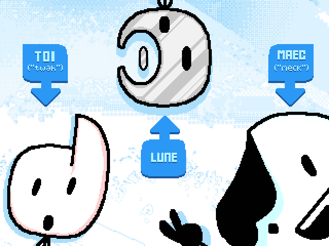 You play as Toi, (Name is pronounced like "twa", the French way) the co-host of a travel blog. He hosts said blog with his long-time best friend, Maec. The both of them live in a small house in the White Plane. With them lives their best friend Lune, the nicest couch potato you'll ever meet.