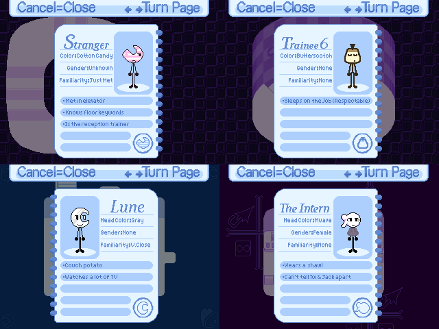 Introducing the Character Log! This is a notebook that automatically adds entries for new characters you meet and special info about them. Each door gets its own Character Log dedicated to the characters you interact with in it.